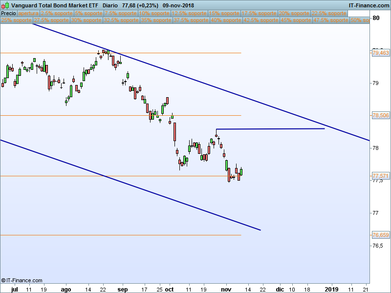 BND, Vanguard Total Bond.- La pasada semana nos quedamos anclados en el SOR anual 77.57. Deberemos buscar cierres por debajo de este SOR para dar continuidad bajista hasta la base del canal. El último máximo relevante está situado en 78.30, mientras estemos por debajo de ese nivel, la predisposición debe ser bajista.