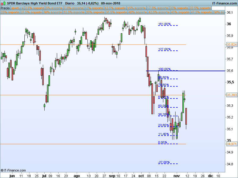 High Yield (JNK).- Tuvimos durante la semana pasada un rebote en las cotizaciones que nos llevó al SOR 35.393, lugar donde hemos tenido un fuerte rechazo. En esa zona confluía el retroceso 61.8% del último impulso bajista. Vamos a considerar como escenario más probable que hagamos mínimo anual para buscar el SOR 34.9741.