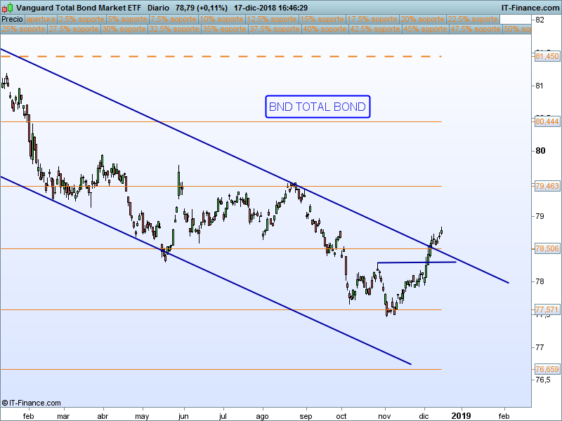 Otro ETF que también nos gusta es el BND de Vanguard, con una mayor diversificación que los anteriores y que también está desplegando un tramo importante al alza tras romper la estructura bajista.