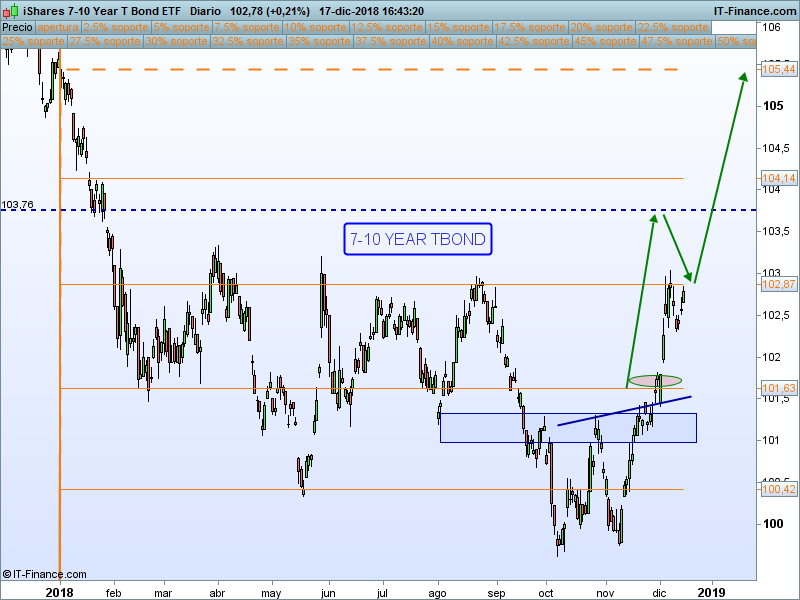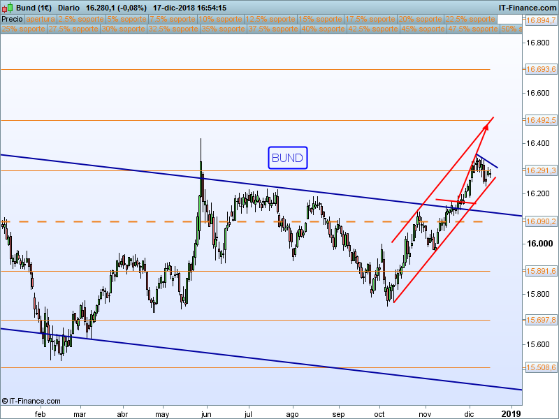 Cuando hablamos de Europa nos gusta mirar el bund alemán. Llevamos dentro de una canalización alcista desde primeros de Octubre, que nos llevó primero a recuperar el precio de apertura anual y ahora estamos intentando consolidar el SOR 12291 para «asaltar» el máximo anual. Cierres por encima de esta cota pueden alzarnos hasta el SOR 16492.