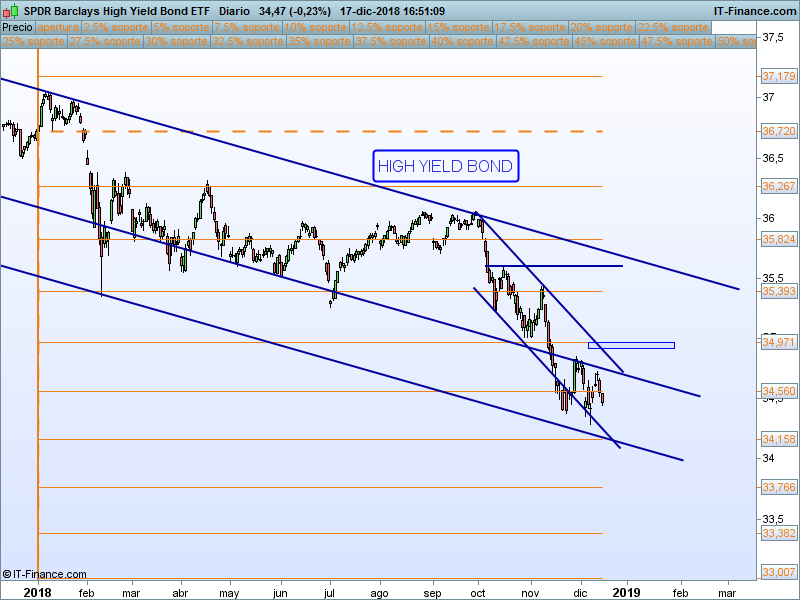 Venimos avisando tanto en estos monográficos como en los boletines que enviamos a nuestros suscriptores de forma semanal ( ¿Aún no te has suscrito? puedes hacerlo desde aquí ) que hay que distinguir entre los distintos tipos de bonos ya que no todos ellos han iniciado un impulso alcista. Este es el caso de los high yield, que siguen mostrando una clara tendencia bajista en las cotizaciones.