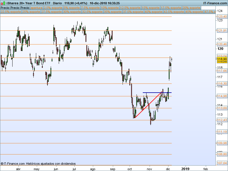 Creemos que buenas alternativas son los ETFs IEF (ishares 7-10 year Tbond ETF), TLT (ishares +20 y tbond) o el BND Total Bond de vanguard. Dado que los europeos tenemos muchas dificultades para poder contratar estos productos, podemos utilizar unos sucedáneos en el IDTL (+20 y) IUAG y a más corto plazo (1-3 años) el IBTS. Con ellos podremos aprovecharnos del momentum de la renta fija.