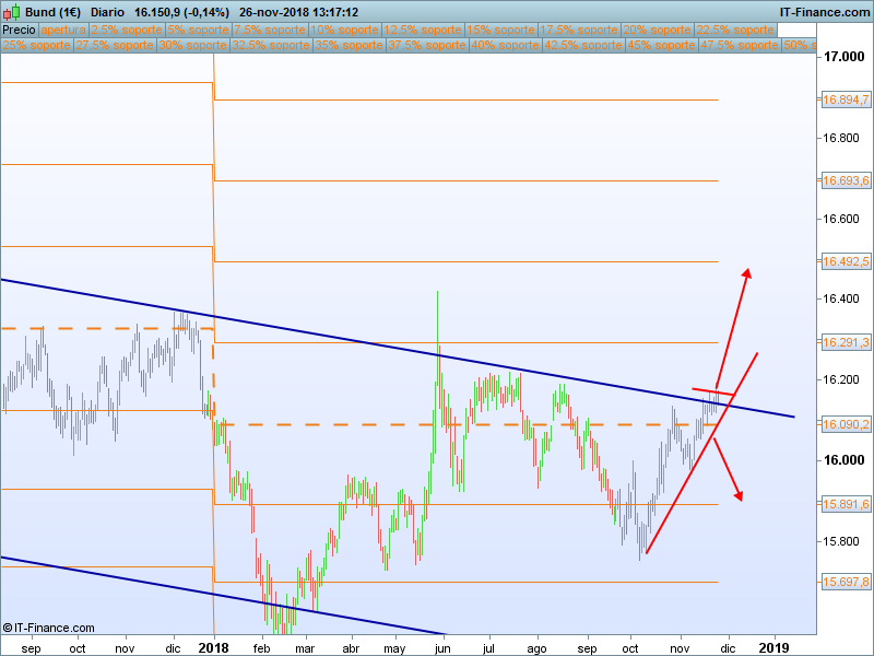 En Europa, el Bund sigue enredado en la parte alta del canal. Ha cerrado por encima del PAA, por lo que vamos a considerar como escenario más probable mientras no pierda este nivel, alcanzar el SOR 16291 .