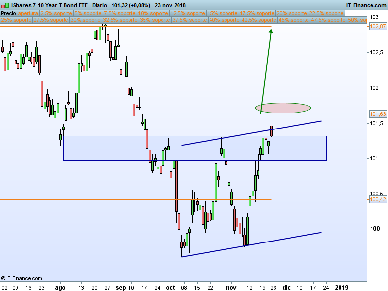 En el caso del IEF (7-10years TBOND Ishares), el SOR significativo lo encontramos en 101.63. Un cierre por encima de este nivel nos dejaría un tramo sin mucha oposición hasta el 102.87.