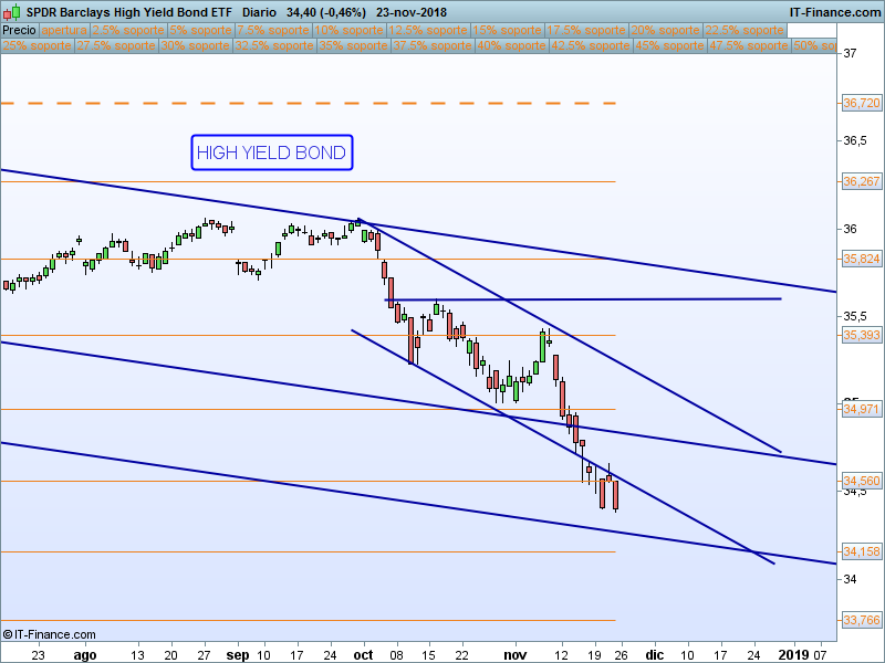 Los bonos HighYield, tanto en EE.UU como en Europa siguen en una clara tendencia bajista en cuanto a cotizaciones, debemos seguir apartados de los activos vinculados, al igual que los bonos de los países emergentes.