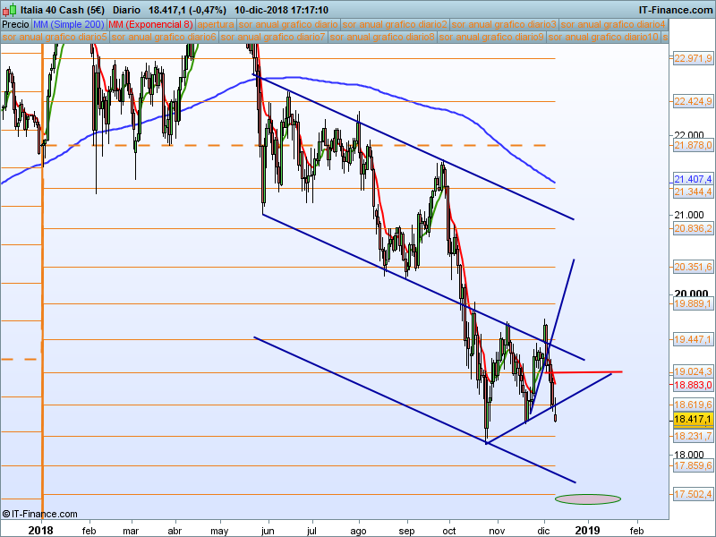 FTSE MIB (Italia).- Rompemos la 0B trazada con implicaciones muy bajistas ya que abre la puerta a un nuevo tramo en corto. Un cierre por debajo del SOR 17859 (minimo anual) nos deja camino despejado al SOR 17502.