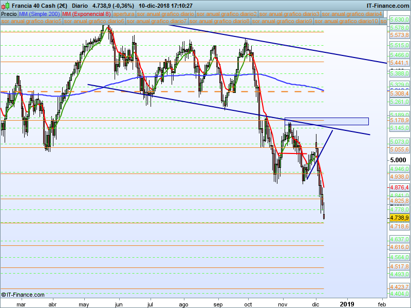 CAC40 (Francia).- Vamos directos al doble soporte SOR/Refugio en 4718, cierres por debajo de esta cota nos llevan al refugio 4637.