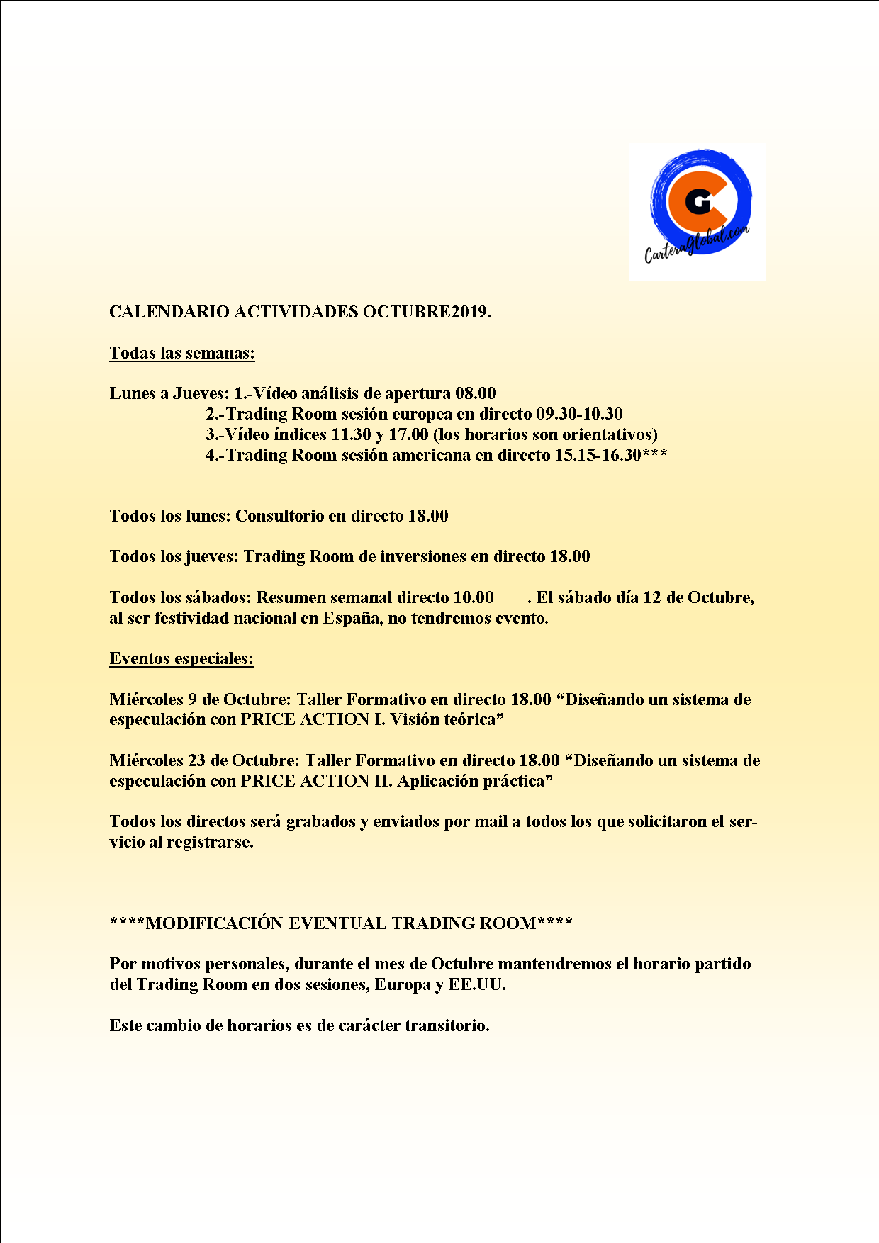 Este es el calendario de eventos que tendremos en nuestro Club de Bolsa durante el mes de Octubre. Siempre hablamos de hora española.