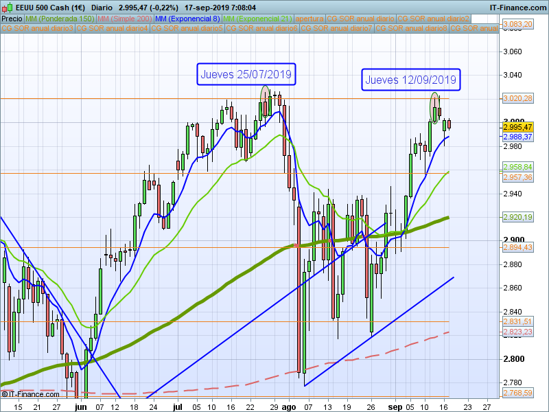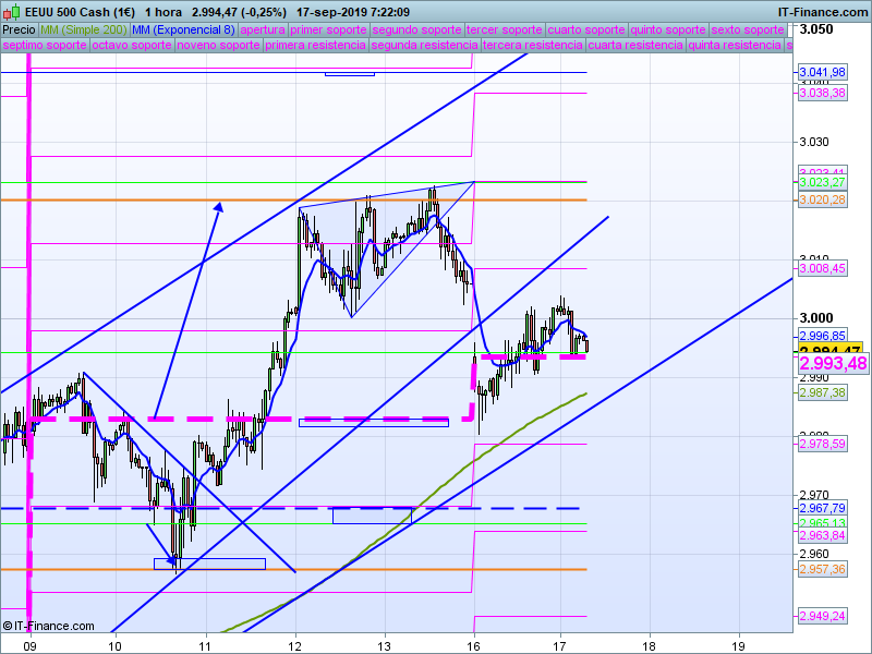 Dentro de la tranquilidad que se presupone para el día de hoy, por encima del PAS podemos seguir adoptando predisposición alcista prestando mucha atención a la posible reacción en la zona de 3008, cota próxima al 61.8% de retroceso del movimiento bajista que se inició el pasado viernes. Por encima de 3008 volvemos a tener el SOR anual 3020 y como nivel más relevante a tener en cuenta una vez conseguidos nuevos máximos históricos el SOR del complejo trimestral 3042.