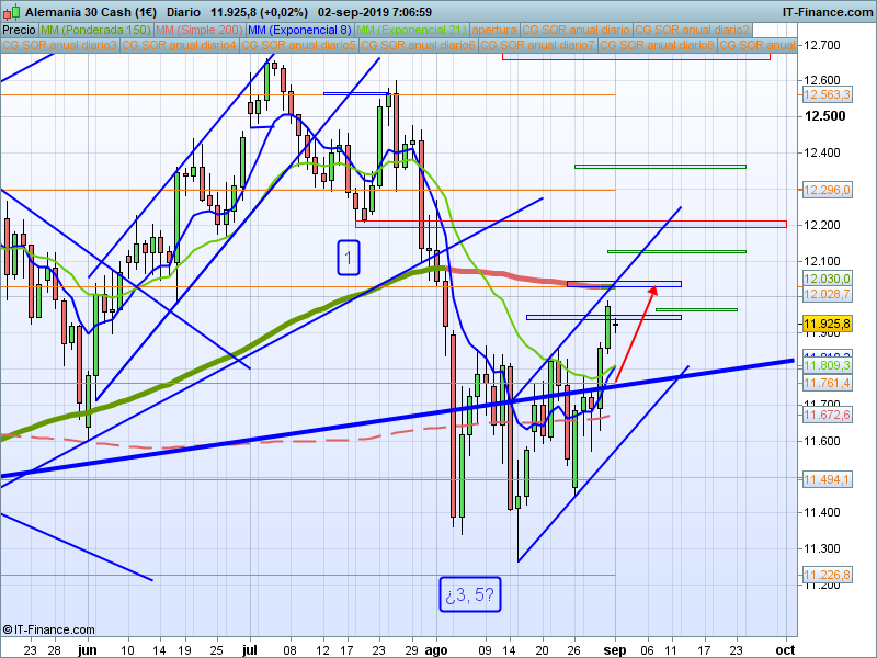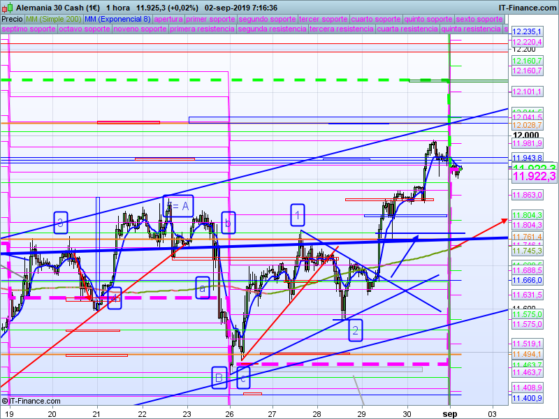 Si bajamos a gráficos de H1, hoy tenemos el nacimiento de un nivel que va a ser muy importante durante todo el mes de septiembre: el precio de apertura mensual, que en esta ocasión se sitúa en 11922. Mientras estemos por encima de este nivel, podemos adoptar predisposición alcista para ir a alcanzar el mencionado SOR anual 12029. Por encima de este último, los siguientes objetivos los vamos a tener en 12129 y mucha atención al 12193 ya que la superación de este nos resolvería una duda operativa, ya que estaríamos invalidando la posibilidad de que nos encontremos en una onda 4.