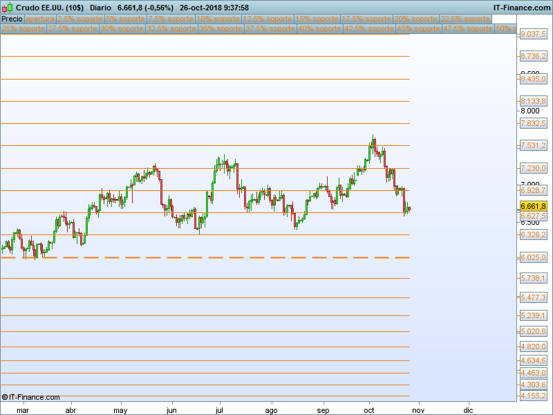 CRUDO LIGERO WTI.- Esta semana hemos caido hasta el SOR 6627 y llevamos unos días enredando en él. Cierres por debajo implicarían ir a buscar el 6326 rompiendo la estructura alcista que traemos desde mayo de 2017.