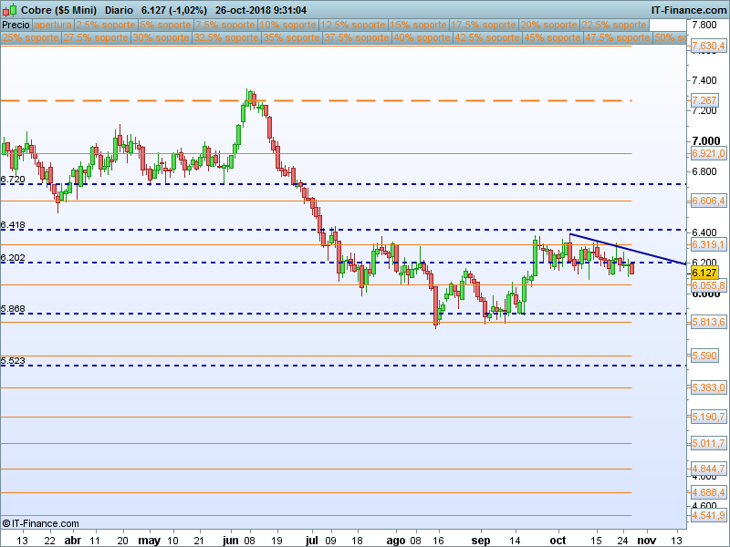 COBRE.- Sin novedad esta semana, nuestro planteamiento alcista pasa por la rotura de la 0B. Cierres por debajo de 6055 nos alejarían de este escenario.