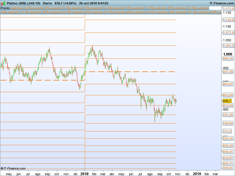 PLATINO.- Se ha superado el anterior máximo relevante, por lo que vamos a considerar un movimiento al alza. Cierres por encima de 852 nos llevarán al 892 SOR anual.