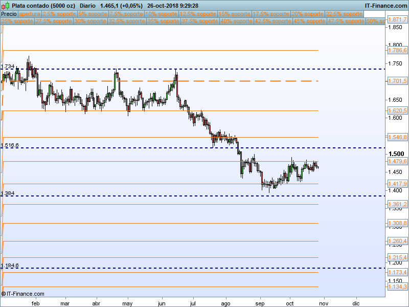 PLATA.- La resistencia que proporciona el SOR 1479 está conteniendo el precio, cierres por encima nos predisponen a buscar los 1546. Si por el contrario nos vamos a buscar de nuevo el SOR 1417, habría que predisponerse hacia el 1361.