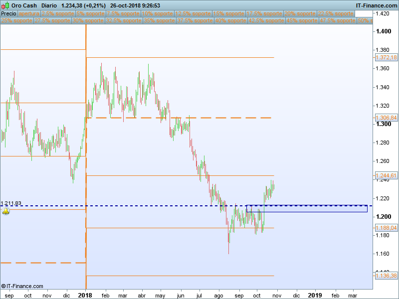 ORO.- Tras el estirón del pasado 11 de octubre, nos hemos metido en un lateral justo por debajo del SOR 1244. Esperamos un retesteo a la zona quebrada para incorporarnos con objetivo PAA.