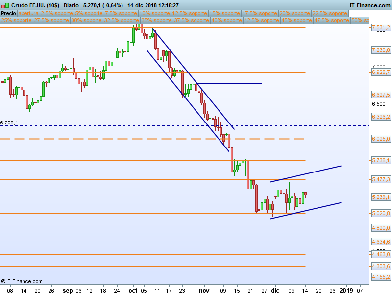 CRUDO LIGERO WTI.- Ya venimos comentando a diario el soporte 5020 ha sido el bueno, la corrección está girando entorno al SOR anual 5239. Dada la estructura correctiva que está formando, parece difícil llegar al PAA que era el punto en un principio esperado.