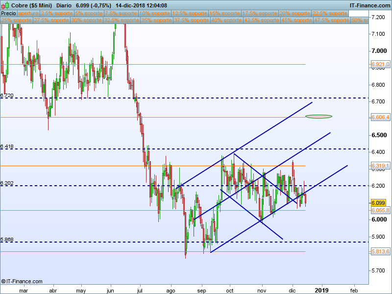 COBRE.- No se ha movido mucho desde el último análisis. Cierres por debajo del SOR 6055 nos hacen abandonar de forma momentánea la idea de entrar en el lado largo.