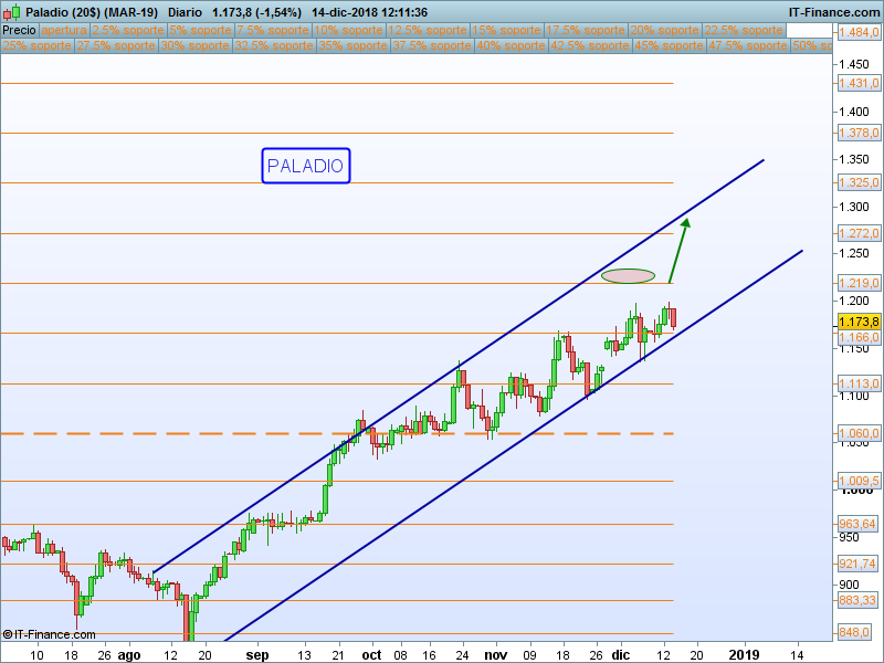 PALADIO.- Muy lentamente seguimos avanzando posiciones y ya casi estamos en el SOR 1219 objetivo marcado hace semanas cuando retesteamos el PAA. El tiempo juega a nuestro favor y en caso de romperlo podremos buscar una extensión hasta 1272.