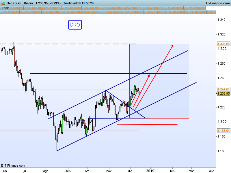 ORO.- Primer objetivo SOR 1244 alcanzado y estamos teniendo en el día de hoy algo de rechazo en ese punto, tras varios días de prueba en el que no se ha conseguido superar. Vamos a fijarnos a muy corto plazo en la cota 1232, para una posible reincorporación. Cierres por encima de 1244 abren la puerta a la siguiente parada 1267.