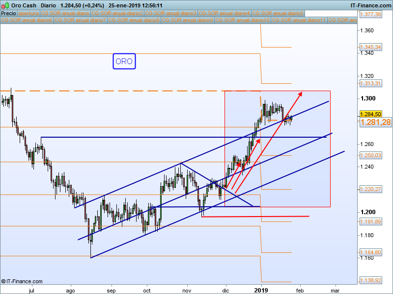 Toda la semana pegados al precio de apertura anual 1281. Mientras sigamos por encima mantenemos la predisposición alcista con el 1313 como primer objetivo.
