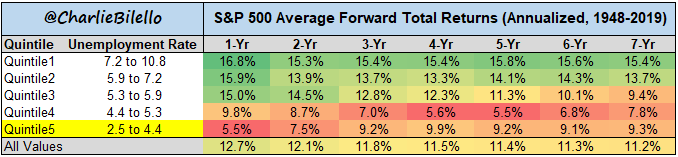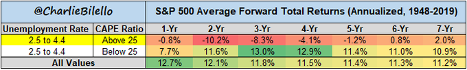 La fortaleza del empleo en EEUU es digna de admiración, con los datos del pasado viernes, la tasa de desempleo se sitúa en un 3.6%. ¿Quieren saber como ha reaccionado historicamente la bolsa cuando tenemos estos niveles tan bajos?, vean lo siguientes gráficos facilitados por Charlie Bilello.