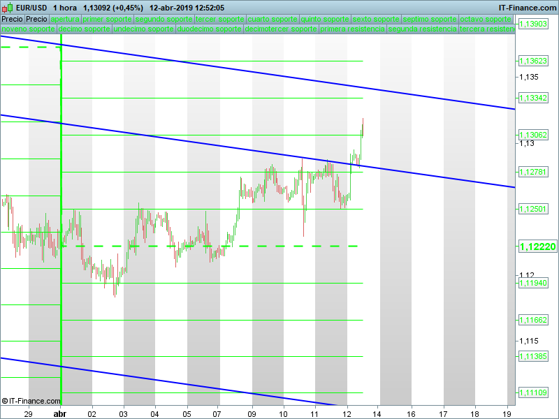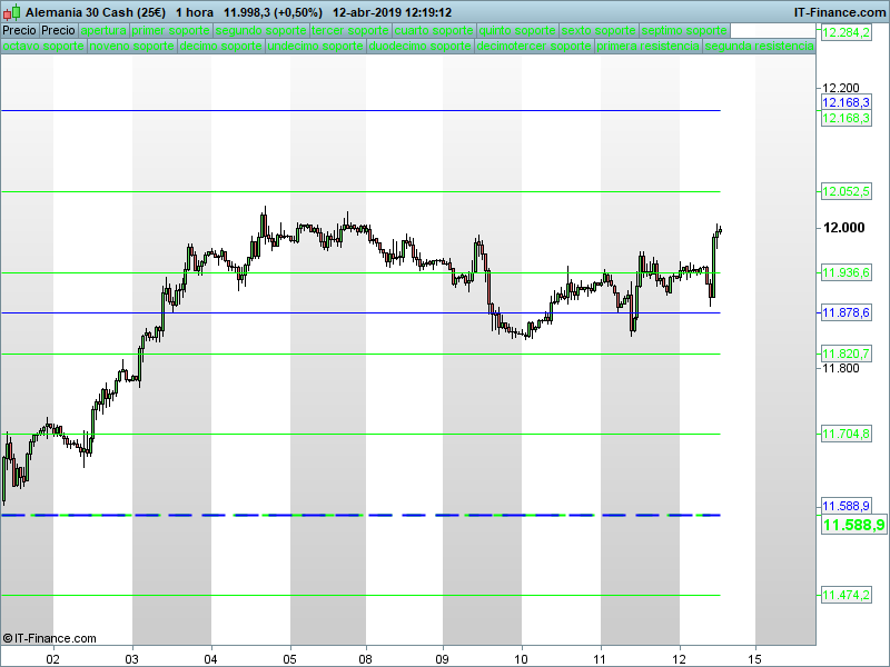 En un primer vistazo pudiese parecer que no están funcionando los niveles calculados para el mes, pero es a simple vista. Ya hemos comentado en múltiples ocasiones la necesidad que tenemos de «buscar» la jerarquía de SORs. Los máximos de abril coinciden con un SOR anual (12028), mientras que los apoyos de esta semana se realizan sobre el trimestral (en azul). En esta circunstancia y mientras se respete la estructura de niveles, las siguientes cotas a alcanzar se sitúan en 12052 y 12168
