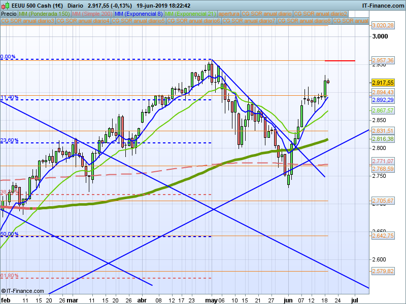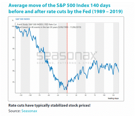 En el se puede apreciar como se ha comportado históricamente el SP500 140 días antes de la bajada de tipos y 140 días después del recorte. Vemos como históricamente lo que podemos esperar tras este acontecimiento es una subida a corto plazo que da paso a un periodo de lateralización.