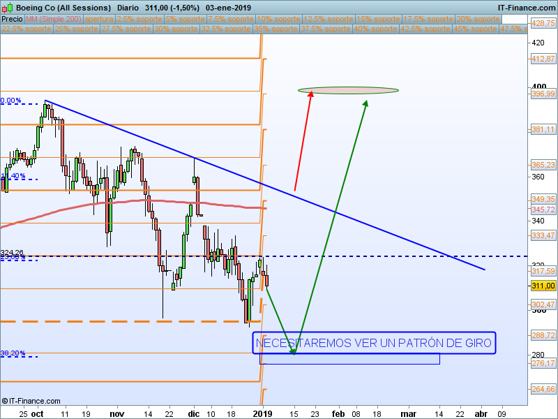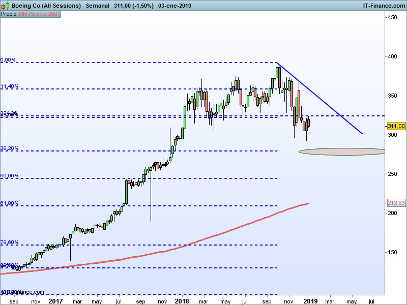 Boeing (BA).- Entra dentro de otro de los sectores «llamados» al rebote, sin embargo la estructura nos indica a pensar que aún le pueda quedar un tramito bajista. Aún así la hemos pasado a nuestro radar de seguimiento y nos animamos a compartirlo. En gráfico semanal y partiendo del impulso iniciado en 2016, no hemos llegado a retroceder el 38.2% y aún podríamos estar desplegando la C de la corrección. Si el precio se encaminase hasta la zona del 38.2% podríamos esperar un patrón de giro alcista, si por el contrario, tuviésemos un fallo de C y con perforación de la 0B marcada, podríamos adoptar predisposición alcista con un objetivo inicial en los 400.