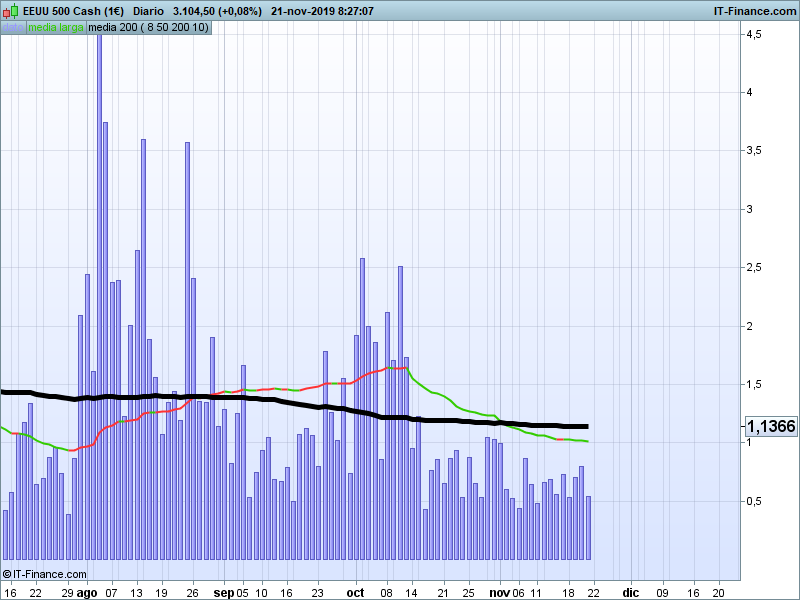 Sin embargo, uno de los requisitos que debemos ver en los mercados para que valide este movimiento es el incremento de volatilidad, que sigue sin producirse. Si nos fijamos en el SP500 seguimos manteniendo una volatilidad muy baja, claramente por debajo de su volatilidad endógena (su media de más largo plazo). En el siguiente gráfico podemos apreciar como las barras azules que representan el rango de actividad diario se mantienen muy por debajo de la linea negra que marca la volatilidad endógena.