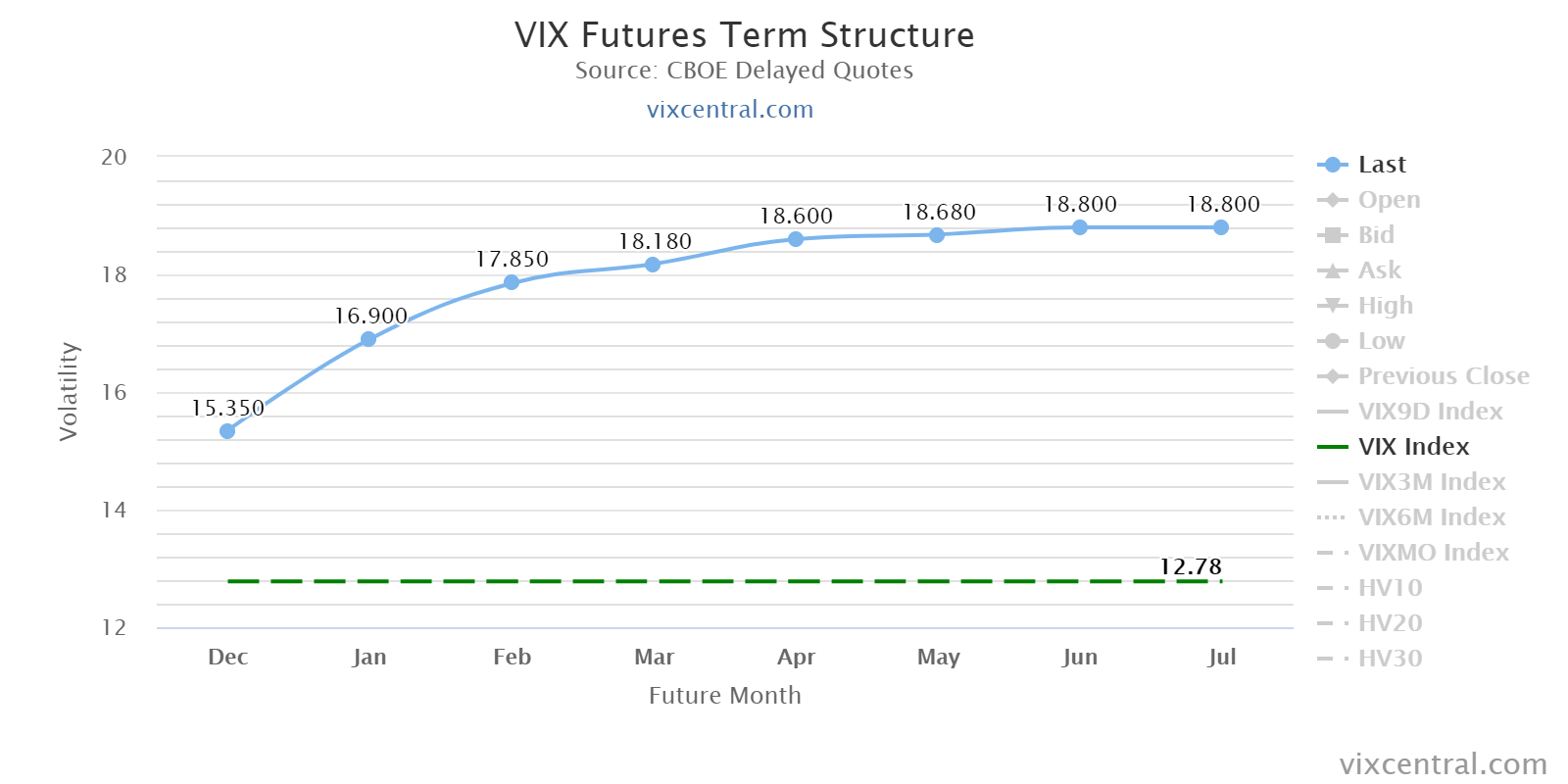 Y si además, vemos la estructura de los futuros del VIX, tampoco muestran síntoma alguno de debilidad. La curva de futuros se mantiene con pendiente positiva y claramente por encima de la cotización actual.
