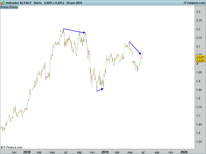 Otro indicador más, el spread XLY/XLP. O lo que es lo mismo, cómo se está comportando el consumo cíclico respecto al consumo defensivo. Cuando la «economía real» marcha viento en popa, este indicador mantendrá una clara pendiente positiva. Vemos como en este momento también nos marca una clara divergencia bajista respecto a lo que hacen las bolsas. Para aquel que quiera curiosear, le animo a que busque las divergencias presentadas entre este indicador y el SP500 en septiembre-octubre primero y después en diciembre.