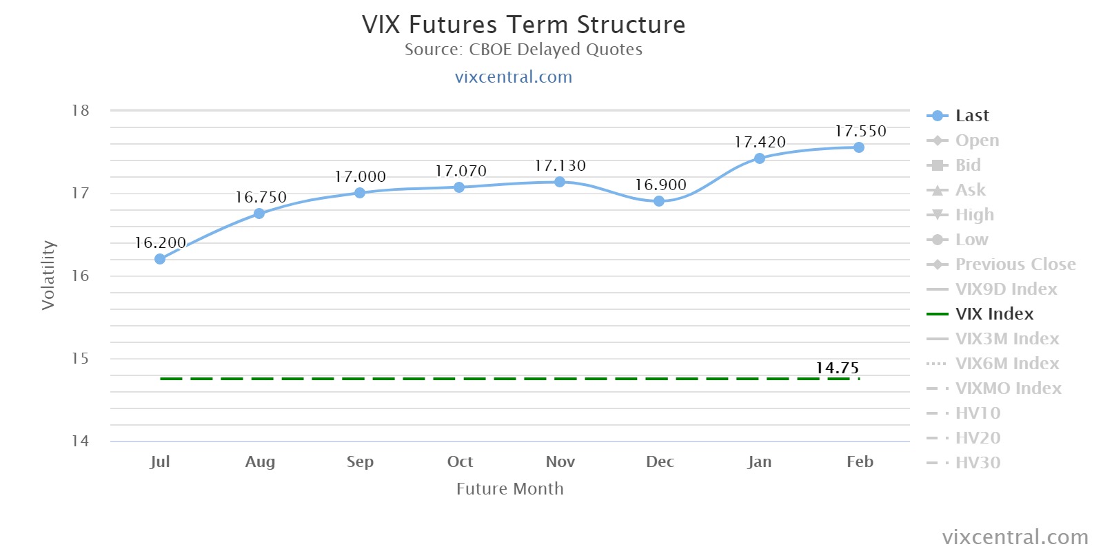 La línea verde marca el nivel actual, la azul marca la estructura de futuros. Por un lado, que la estructura tenga una pendiente positiva es positivo, valga la redundancia. El VIX lleva varias sesiones por encima de 12, aunque sin alcanzar niveles que deban preocuparnos. Habrá muchos que no estén de acuerdo conmigo, pero yo suelo fijar tres niveles en este indicador: 12, 16 y 20. Por debajo de 12, mercado con poco riesgo, por encima de 20, cuidadín.