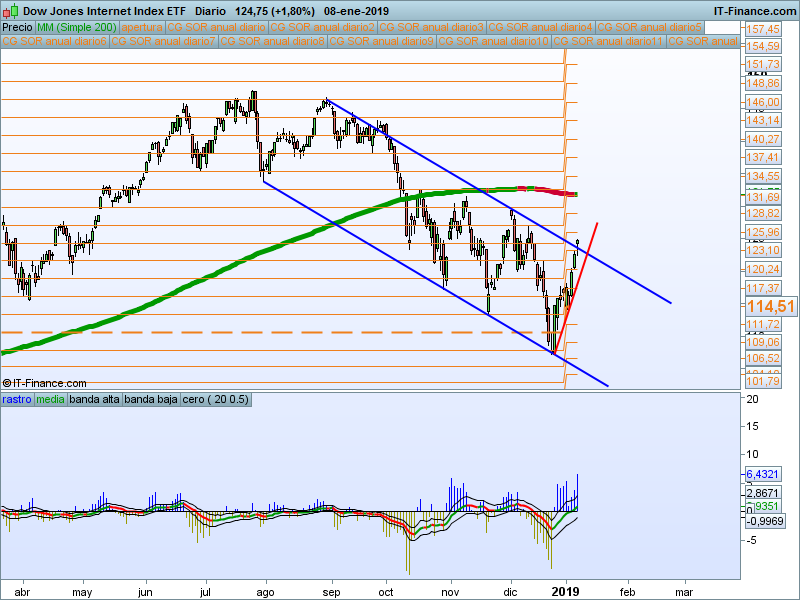 FAANG(FDN).- Hemos llegado a la parte alta del canal y a nuestro primer objetivo en el SOR 123.10 cerrando por encima de estos. Vamos a pensar en la extensión a la media de 200 sesiones mientras no perdamos la LT dibujada en roja. A ver si Apple se pone las pilas y nos echa una manita.