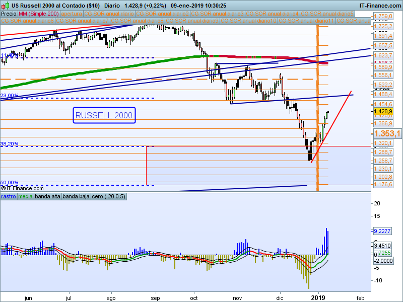 Small&Med Cap (Russell2000).- Es sin duda, dentro de los índices importantes, el que más fuerte está este año, pero recordamos que fue el más débil en el 2018. Deberíamos ver continuidad alcista al menos hasta la zona del sOR 1454.
