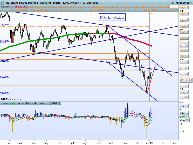 Materiales (XLB).- También nos hemos aproximado mucho a la primera zona de fricción, el SOR 52.27. Si tenemos cierres por encima podemos continuar nuestra travesía hasta la media de 200 (con resistencias por el camino). La predisposición alcista la seguiremos manteniendo mientras estemos por encima del PAA2019.
