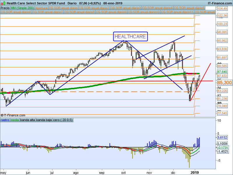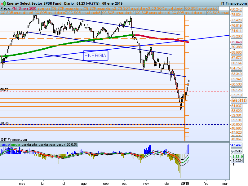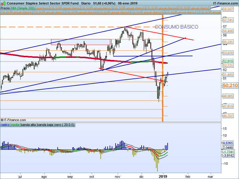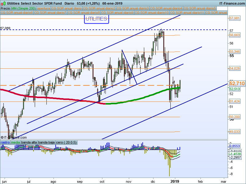 Utilities (XLU).- Lo repetimos cada semana, pero no deja de ser cierto que es el sector menos débil de todos. Tras una corrección importante de más de un 10% desde el rechazo en la zona de máximos, la media de 200 sesiones y el nuevo Precio de apertura anual (PAA) nos hacen incluir de nuevo este sector dentro de nuestro portfolio operativo. Mientras permanezca por encima del PAA2019, tenemos un primer objetivo en el SOR 54.028