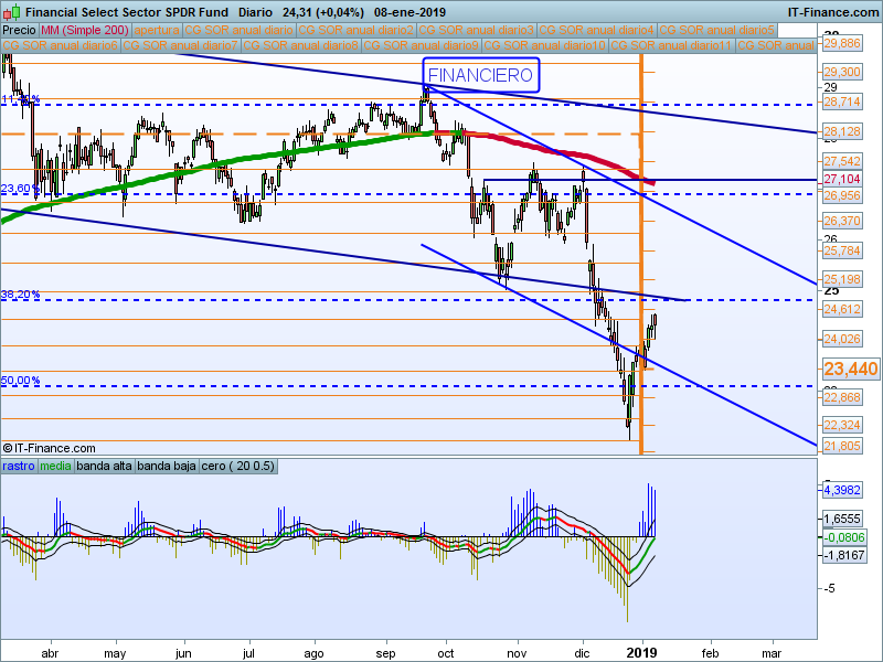 Financiero(XLF).- Realmente nos fiamos poco de este sector, es uno de los más débiles pero eso no quita que tenga derecho a rebotar como cualquier otro sector. Mientras estemos por encima del PAA2019 en 23.44 podemos seguir adoptando predisposición alcista teniendo el ojo encima de la zona comprendida entre los SORs 24.61 y 25.198, al pasar por allí la base del canal.