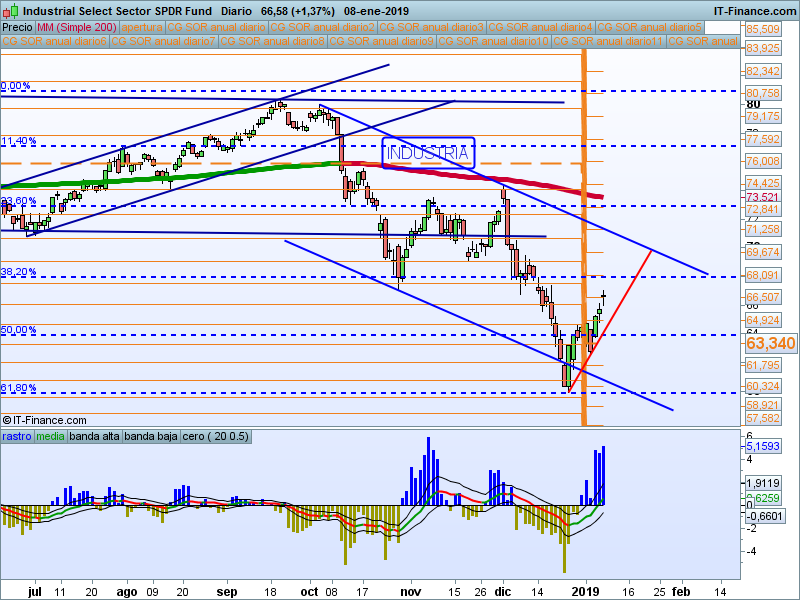 Industria (XLI).- Técnicamente seguimos teniendo hueco, nos vamos a encontrar en un escollo en el SOR 68.09. El PAA2019 está en 63.34 y mientras estemos por encima nuestra predisposición es alcista para buscar valores dentro de este sector.