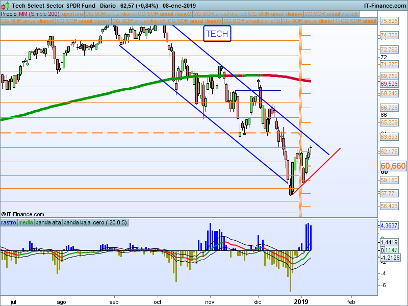Tech (XLK).- Estamos cerca del primer obstáculo comentado la semana pasada, el PAA2018 en las proximidades del 64 y parte alta del canal bajista de corto plazo. La presencia de la mano fuerte es significativa, por lo que si tenemos cierre por encima de la zona señalada seguiremos con nuestra predisposición alcista en este sector. En caso de ver cierres por debajo del PAA2019 en 60.66 abandonaremos esta predisposición