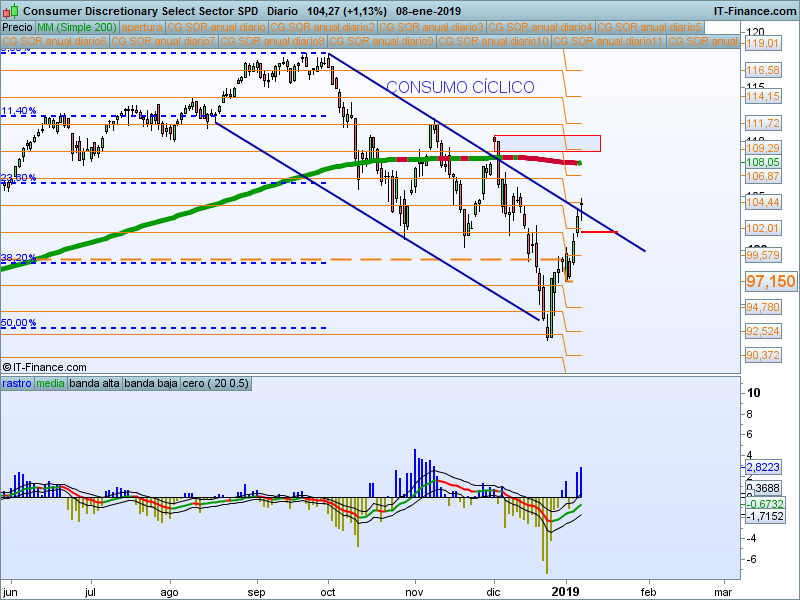 Consumo cíclico (XLY).- Máxima cautela con este sector, aunque la vela nos marca continuación en el rebote, hemos llegado a primer SOR relevante, parte alta del canal, que comentamos la pasada semana. Las lecturas de mano fuerte son positivas pero mucho menos agresivas que en otros sectores analizados. Mientas permanezcamos por encima del SOR 102.01