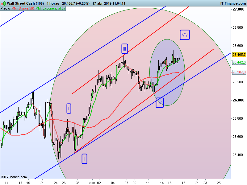 Vamos a centrarnos pues en lo que está pasando dentro de esta quinta onda, metamos la lupa y vamos al círculo señalado, para ello bajaremos a gráficos de 4 horas.