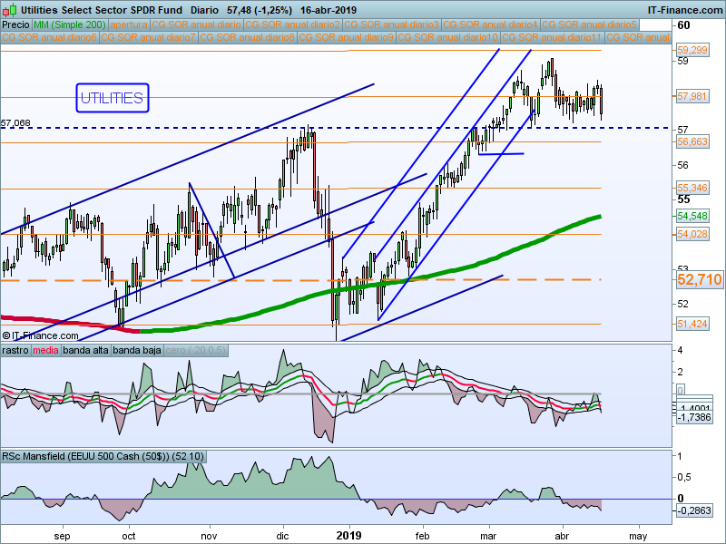 Se complica el asunto en el sector Utilities. Aún estamos por encima de la cota 57, punto que nos hemos marcado como posible reversión, pero la estructura que está dibujando no pinta bien. HCH en zona relevante?