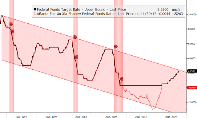 Buceando entre gráficos este fin de semana nos hemos encontrado con este que es particularmente curioso. Me van a tener que disculpar porque no anoté la fuente. Se ha trazado un canal bajista uniendo máximos y mínimos en la evolución de los tipos de interés en EE.UU y las etapas de recesión se han delimitado con barras verticales sombreadas. Como digo, es curioso ver que cuando se llega a la parte alta del canal y se gira, a continuación entramos en un periodo de recesión. Al menos así ha pasado en las últimas tres ocasiones. ¿Adivinan donde estamos ahora?…