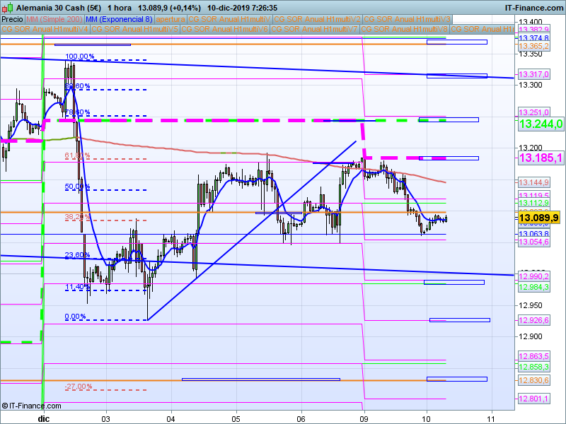 Si bajamos a gráficos de H1 (nuestro principal), el SOR trimestral en 13064 volvió a frenar a la cotización tal y como ya hizo jueves y viernes pasados. Como digo, nos fijaremos en el SOR anual (13098) para adoptar una predisposición operativa en el día de hoy, mientras estemos por debajo continuaremos pensando en el lado corto como opción más probable. Por debajo de 13064 propondremos como objetivos el SOR mensual 12984, el semanal 12926 y, a partir de ahí, el 12830 SOR anual.
