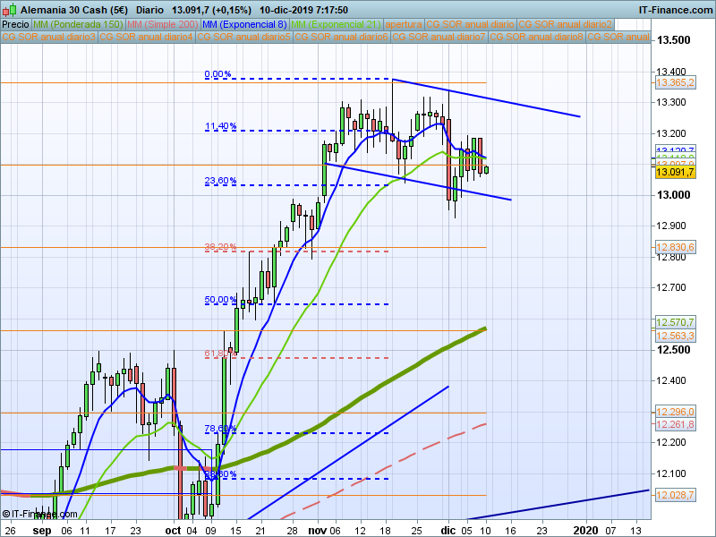 En caso de recuperación del 13098 tendremos un tramo de escasa probabilidad operativa hasta el 13185, que es el precio de apertura semanal, superado este si que parece muy probable que pudiésemos ver una extensión alcista hasta 13244, precio de apertura del mes de Diciembre. A partir de allí, SOR semanal 13317 y anual 13365.