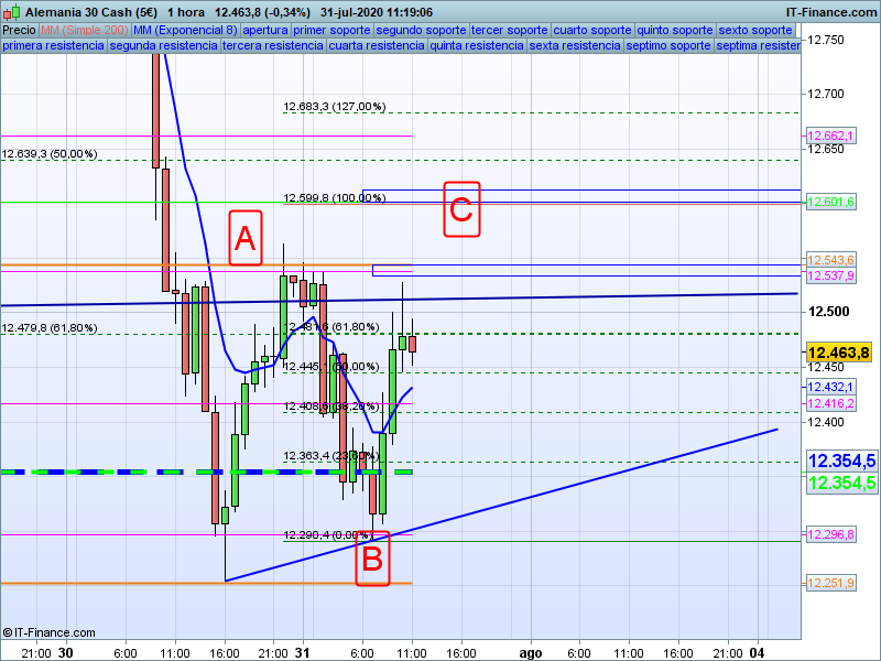 Tal y como venimos comentando desde ayer en el TR de la sesión americana, lo más probable es que estemos dentro de una corrección alcista para, a su conclusión, continuar bajando. Por mediciones, los posibles puntos de finalización de C es 12600, sor mensual, pero tampoco hay que descartar el giro de nuevo en el 12543.
