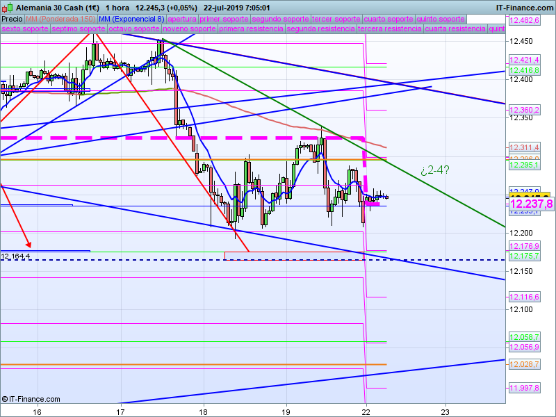 Bajando a gráficos de H1, podríamos estar ya en la subonda 5 de la 5. Vamos a estar atentos a mínimos por debajo de los de la pasada semana y, a partir de ahí, vigilar si el precio recupera por encima del precio de apertura semanal y rotura de la línea 2-4 aún sin confirmar (verde). Esta circunstancia nos podría dar un rebote correctivo en ABC que nos podría llevar de nuevo a la zona 12400-12500 o incluso al 12541 PAT.