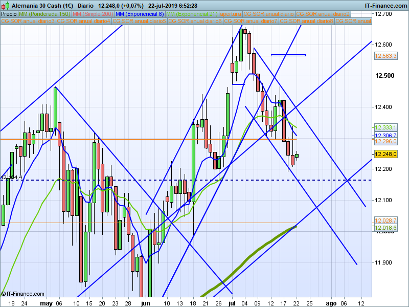 Arrancamos la semana analizando los posibles desarrollos que pudiese tener el DAX para las próximas sesiones. La vela semanal que cerró el pasado viernes tuvo claras connotaciones de continuidad bajista. Reflejó un claro rechazo por arriba terminando en mínimos semanales. En gráficos diarios vimos el viernes una vela muy similar en zona relevante, el SOR anual 12296. Esta circunstancia en principio nos debería hacer pensar en una continuidad bajista hasta el siguiente SOR anual 12028, ahora bien, hemos de tener en cuenta la estructura que se ha formado en este tramo bajista que traemos desde principios del mes de julio y pensar en la posibilidad de que veamos un rechazo en la zona del 12165 (por price action clásico), como posible final de estas primeras 5 ondas.
