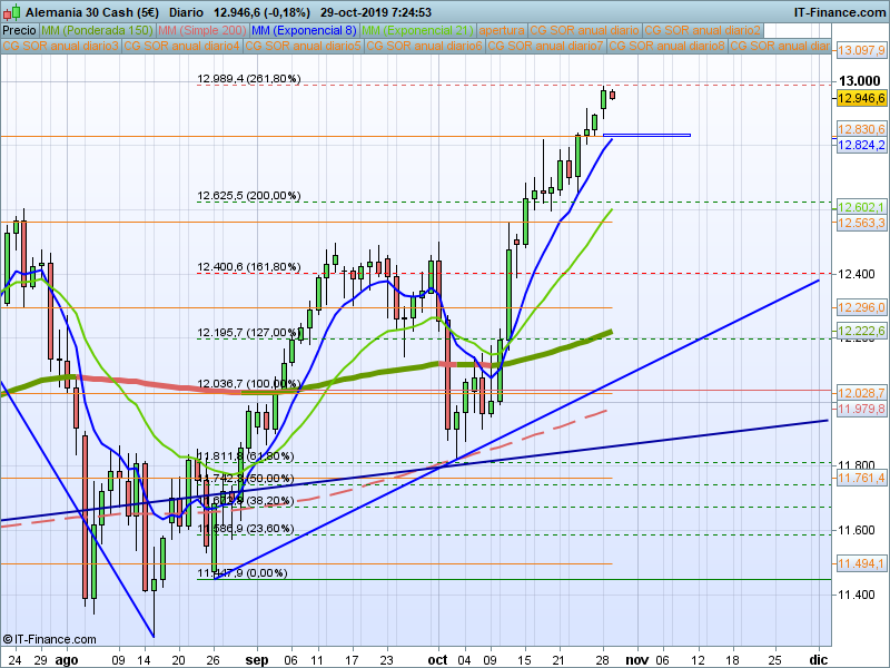 Tercer día consecutivo cerrando por encima del SOR anual 12830 en el DAX Xetra, en principio y bajo el punto de visión que nos aporta el gráfico diario debemos mantener la predisposición alcista a corto plazo mientras estemos por encima de este nivel señalado.