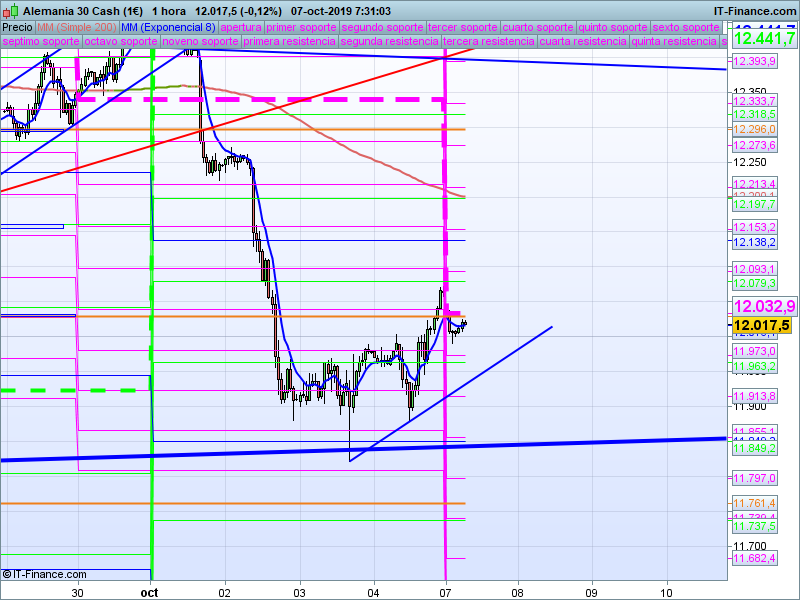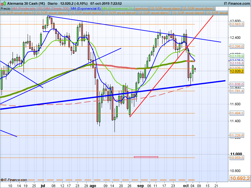 Durante la semana pasada, el DAX Xetra tuvo como movimiento principal un desarrollo bajista que llevó al precio una vez más a la línea de tendencia principal 2/4 (marcada en azul grueso) de la pauta de impulso iniciada en el año 2009 y que fue perforada por primera vez en el transcurso del año 2018. Curiosamente por allí pasaba la media de 200. Desde ese punto se inició un rebote que podemos calificar de débil si lo comparamos con el comportamiento que hemos visto en EE.UU entre jueves y viernes.